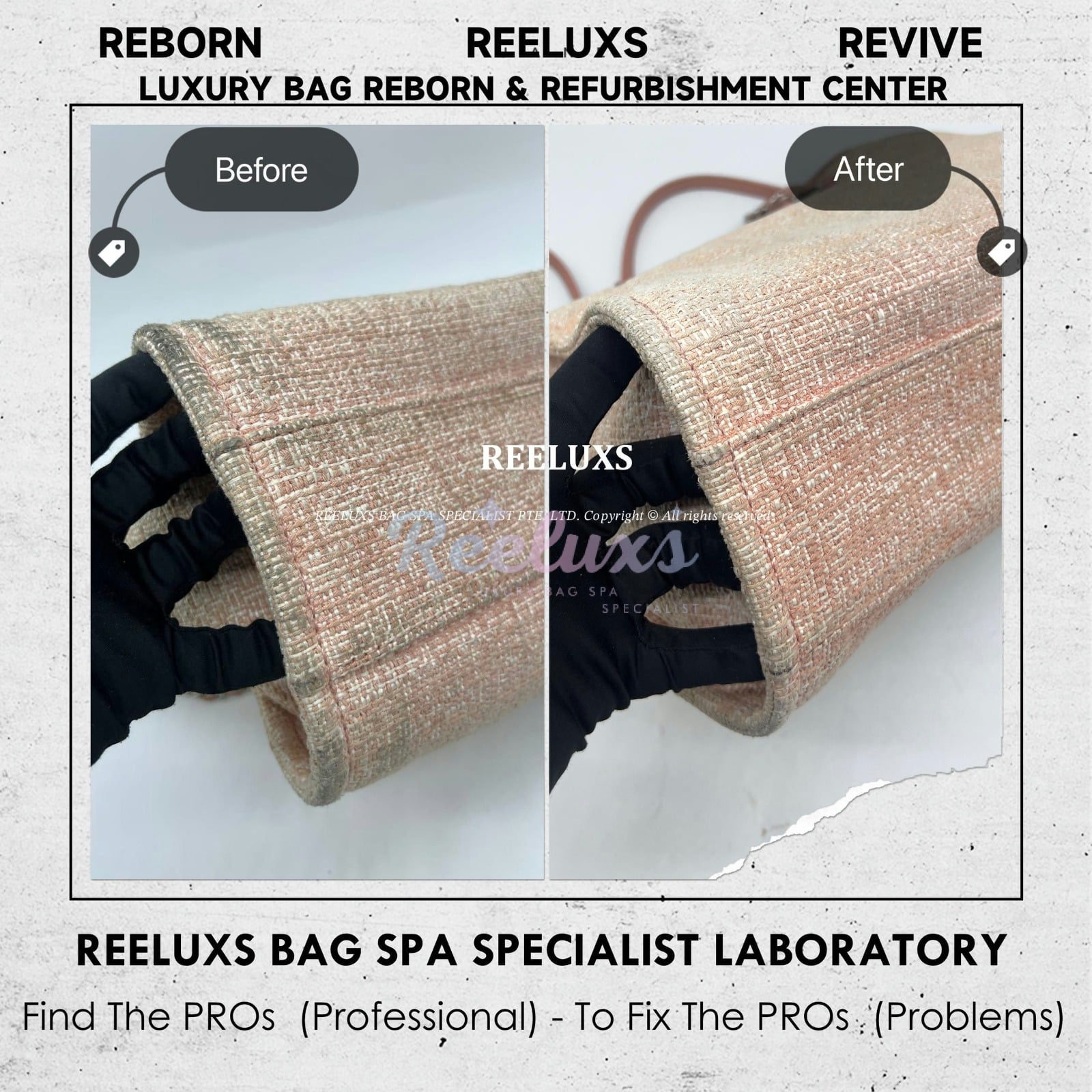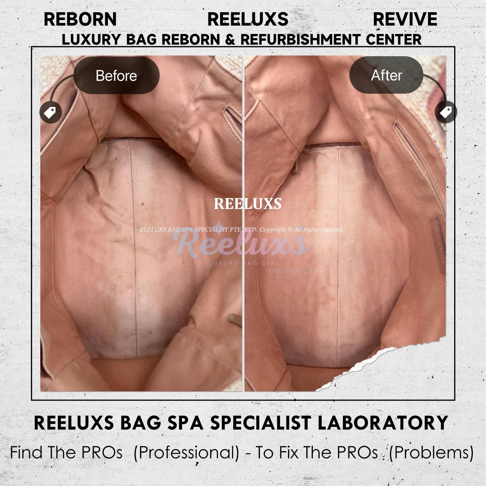 Reeluxs Bag Spa Specialists is your right choice for luxury handbag care. Trust us to perform miracles on your handbags. As the most authoritative and professional luxury bag spa care service in Malaysia and Singapore, Reeluxs Bag Spa Specialist is the trusted bag spa laboratory for caring for your favorite luxury designer bags, featuring France & German certified advanced technology and a reputation for excellent craftsmanship with qualified bag spa chemicals.