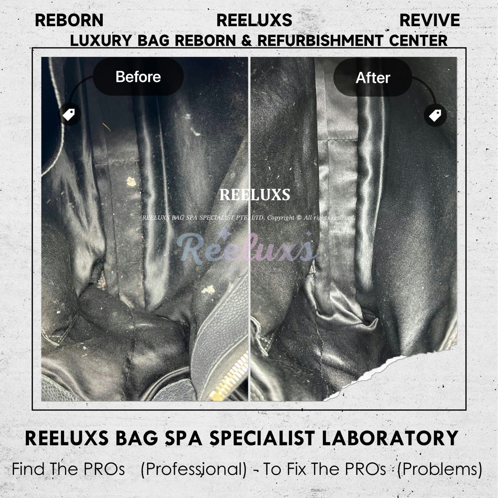 Reeluxs Bag Spa Specialists is your right choice for luxury handbag care. Trust us to perform miracles on your handbags. As the most authoritative and professional luxury bag spa care service in Malaysia and Singapore, Reeluxs Bag Spa Specialist is the trusted bag spa laboratory for caring for your favorite luxury designer bags, featuring France & German certified advanced technology and a reputation for excellent craftsmanship with qualified bag spa chemicals.